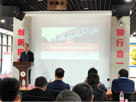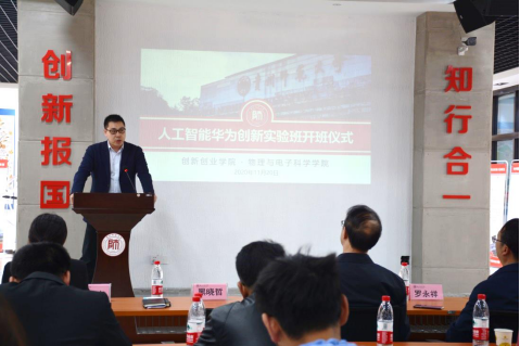 11月20日,贵州师范大学“人工智能华为创新实验班”开班仪式在学校创新创业教育基地举行。华为技术有限公司贵州代表处政企业务部副总经理黑晓哲,华为贵州企业业务部教育行业总经理刘刚,华为全球培训中心AI专家赵慧宁,华为西南区域解决方案总监王军等四位华为技术有限公司领导、专家远道而来出席仪式。我校党委副书记、校长肖远平出席并致辞。校党委委员、副校长罗永祥,校党委委员、宣传部部长路言莉,教务处处长支敏,学校办公室副主任马发亮,学工部副部长田伟等出席仪式,创新创业学院及物理与电子科学学院全体院领导、首届华为实验班40名学生参加,创新创业学院院长、实验班班主任周勋主持了开班仪式。